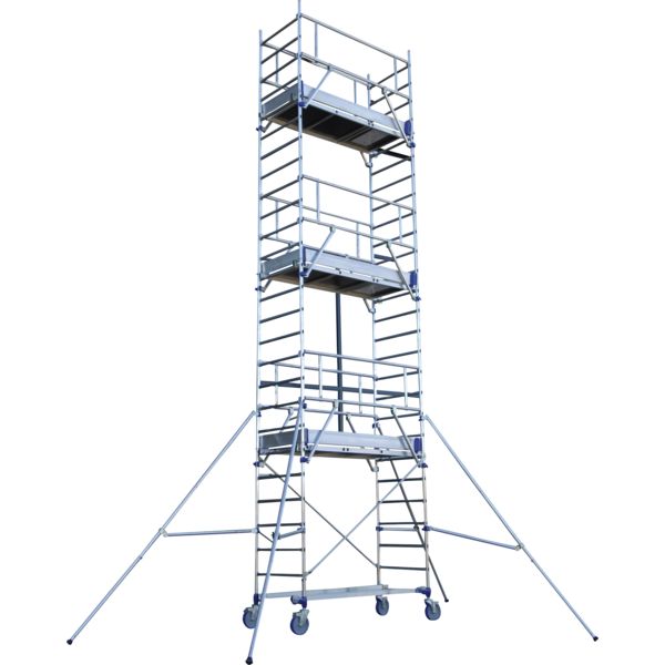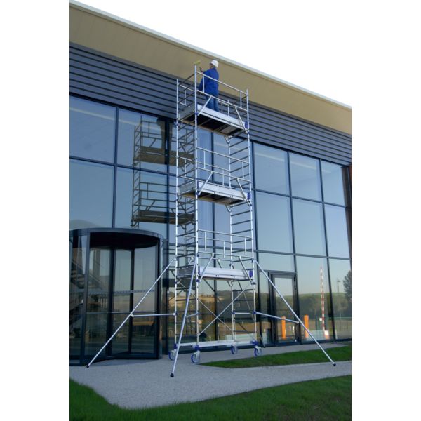 Utilisation sur sol plat et dénivelé. En aluminium brut. Mobile et modulaire. Montage et démontage en sécurité par 1 seule personne, sans vis ni outils. Garde-corps monobloc diagonalisant. Plancher alu/bois tous les 2 m. Plinthes rapportées. Base dissociée équipée de roues Ø 200 mm avec blocage, réglables dans l’axe des montants pour une parfaite stabilité lors des montées et descentes de charges. Pieds réglables, montage en escalier par décalage de niveaux. Équipé de 4 stabilisateurs pivotants. Norme : NF – EN 1004 – Décret 2004-924